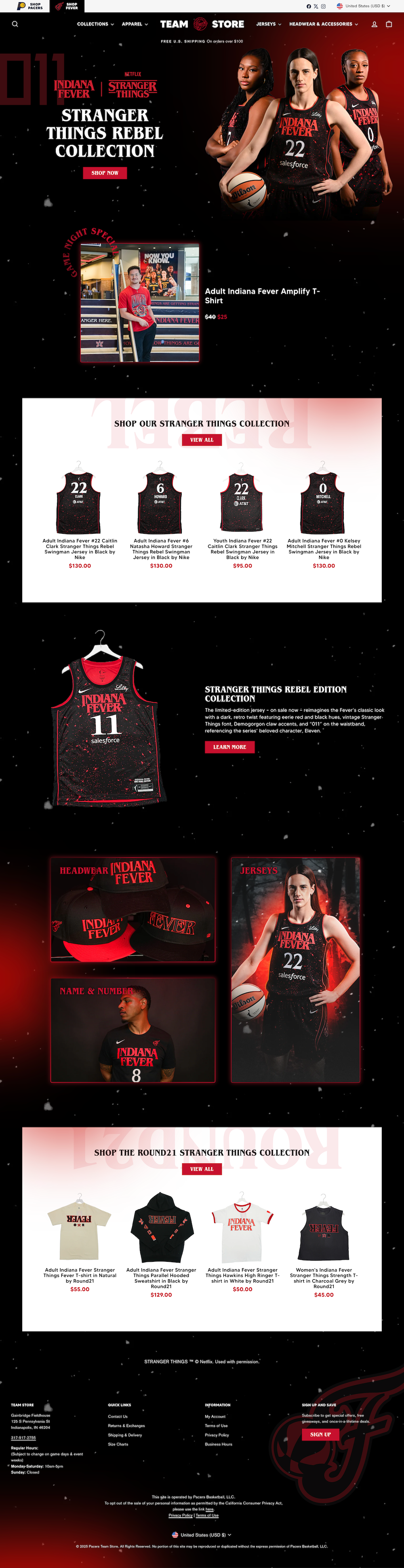 Built Indiana Fever Team Store Stranger Things homepage takeover. The homepage takeover design uniquely highlights relevant products and collections to create excitement for the engaging brand collaboration.