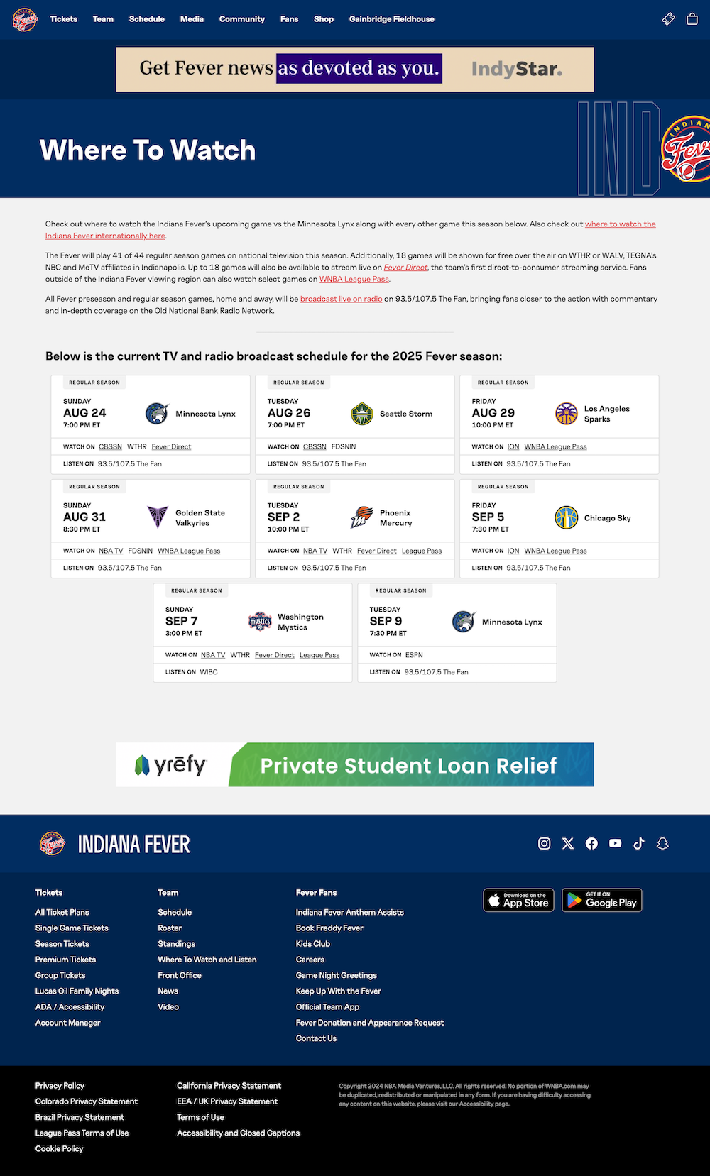 Developed Indiana Fever Where to Watch page to serve as an easy to use reference for fans to quickly learn where they can watch and listen to Fever games throughout the season. The page dynamically updates so the most relevant upcoming games are shown first.