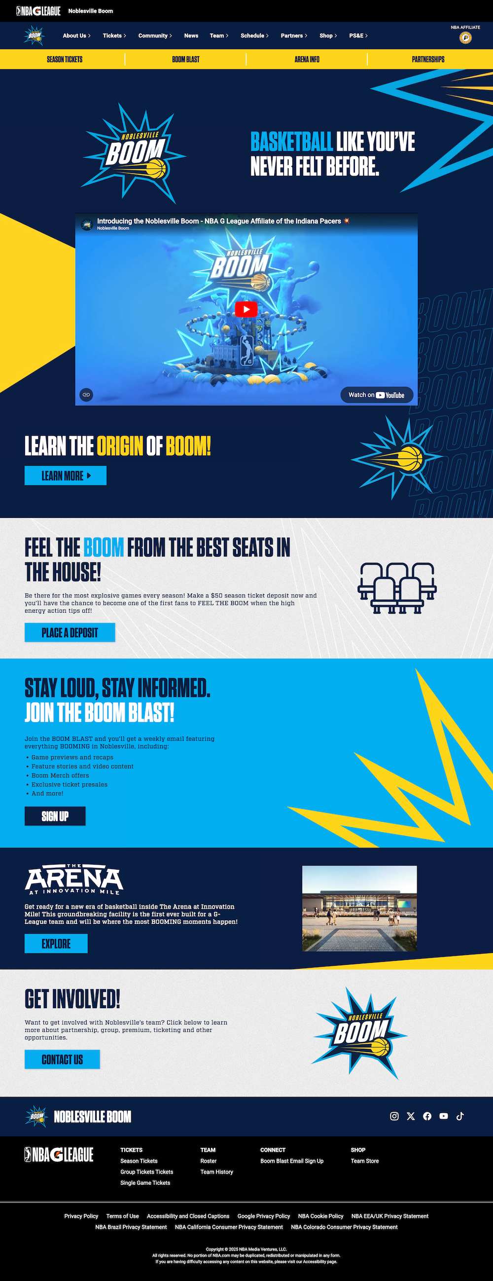Created Noblesville Boom brand launch page to highlight the Pacers' G League affiliate team rebrand. The page tells the story behind the brand, provides ways for fans to engage with the team, and more.