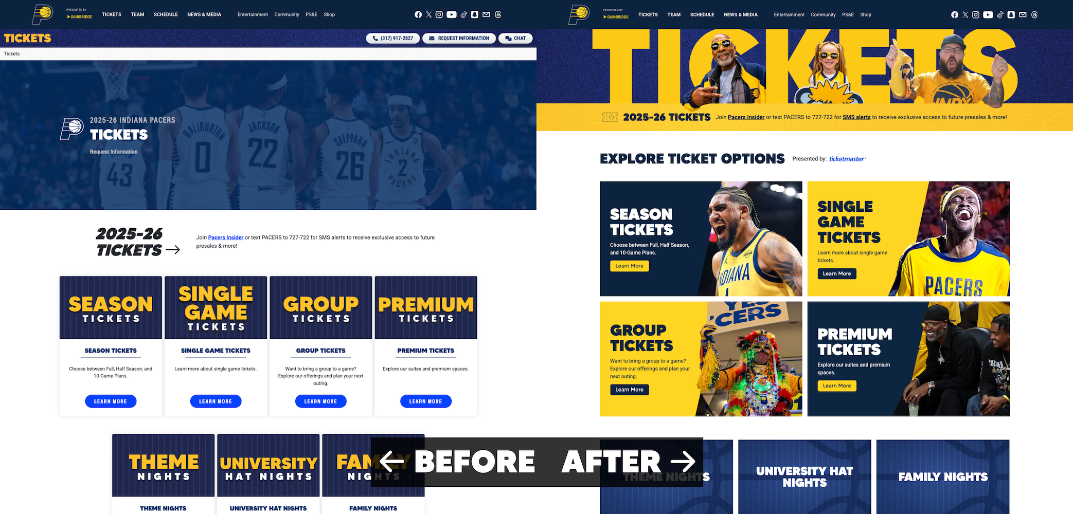 Developed redesigned Indiana Pacers ticket pages that provide more engaging ways for fans to explore ticket packages and connect with ticket reps. Pages include dynamic season ticket plan schedules, clear CTAs, and fan-centric imagery.